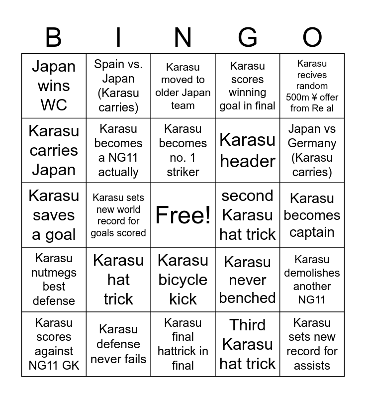 This bingo card has a free space and 24 words: Karasu hat trick, Karasu defense never fails, Karasu becomes no. 1 striker, Karasu scores against NG11 GK, Karasu recives random 500m ¥ offer from Re al, Japan wins WC, Karasu carries Japan, Spain vs. Japan (Karasu carries), second Karasu hat trick, Karasu bicycle kick, Karasu header, Karasu saves a goal, Karasu never benched, Karasu demolishes another NG11, Karasu becomes a NG11 actually, Third Karasu hat trick, Karasu becomes captain, Karasu moved to older Japan team, Japan vs Germany (Karasu carries), Karasu sets new world record for goals scored, Karasu sets new record for assists, Karasu nutmegs best defense, Karasu scores winning goal in final and Karasu final hattrick in final.
