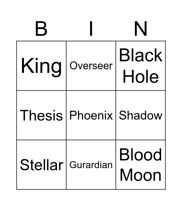 This bingo card has a free space and 8 words: Shadow, Black Hole, Overseer, Stellar, King, Blood Moon, Thesis and Gurardian.