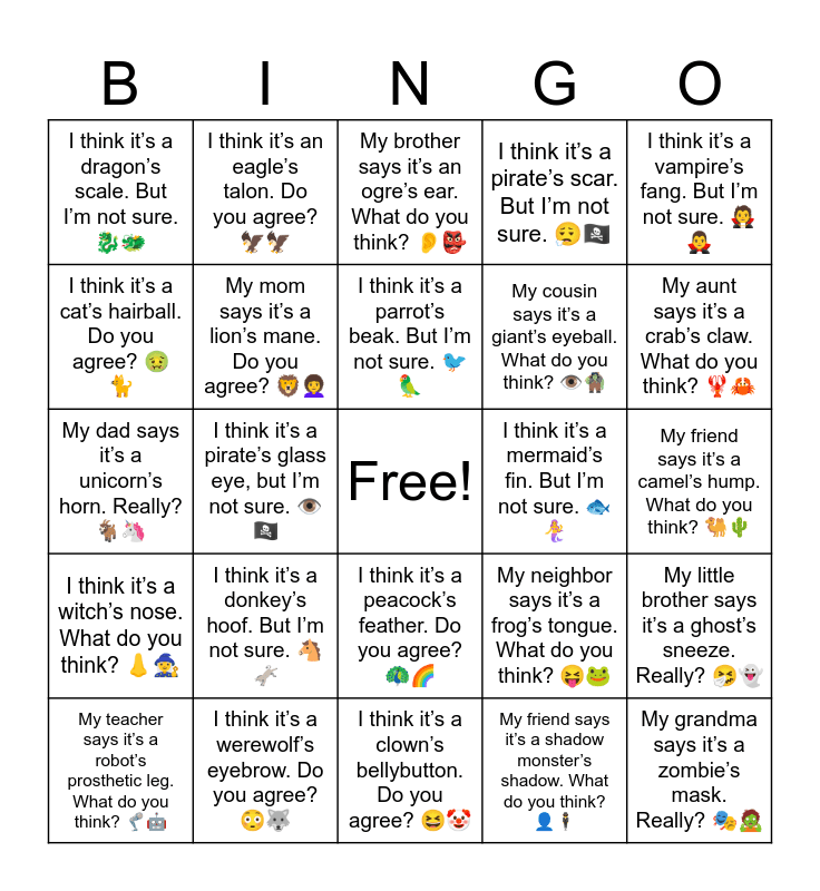 This bingo card has a free space and 33 words: I think it’s a dragon’s tail. What do you think? 🐾🐉, My uncle says it’s a rock star’s wig. Do you agree? 💇♀️🎸, I think it’s a pirate’s glass eye, but I’m not sure. 👁️🏴☠️, My big sister says it’s a bear’s paw. Really? 🐾🐻, I think it’s a witch’s nose. What do you think? 👃🧙♀️, My mom says it’s a lion’s mane. Do you agree? 🦁👩🦱, I think it’s a vampire’s fang. But I’m not sure. 🧛🧛♂️, My teacher says it’s a robot’s prosthetic leg. What do you think? 🦿🤖, I think it’s an eagle’s talon. Do you agree? 🦅🦅, My grandpa says it’s a troll’s false teeth. Really? 😬👹, I think it’s a parrot’s beak. But I’m not sure. 🐦🦜, My brother says it’s an ogre’s ear. What do you think? 👂👺, I think it’s a superhero’s prosthetic arm. Do you agree? 🦾🦸♂️, My cousin says it’s a cat’s whiskers. Really? 🐱😺, I think it’s a mermaid’s fin. But I’m not sure. 🐟🧜♀️, My aunt says it’s a crab’s claw. What do you think? 🦞🦀, I think it’s a werewolf’s eyebrow. Do you agree? 😳🐺, My dad says it’s a unicorn’s horn. Really? 🐐🦄, I think it’s a donkey’s hoof. But I’m not sure. 🐴🫏, My neighbor says it’s a frog’s tongue. What do you think? 😝🐸, I think it’s a peacock’s feather. Do you agree? 🦚🌈, My sister says it’s an alien’s antenna. Really? 🐛👽, I think it’s a dragon’s scale. But I’m not sure. 🐉🐲, My friend says it’s a camel’s hump. What do you think? 🐫🌵, I think it’s a clown’s bellybutton. Do you agree? 😆🤡, My grandma says it’s a zombie’s mask. Really? 🎭🧟, I think it’s a pirate’s scar. But I’m not sure. 😮💨🏴☠️, My cousin says it’s a giant’s eyeball. What do you think? 👁️🧌, I think it’s a cat’s hairball. Do you agree? 🤢🐈, My little brother says it’s a ghost’s sneeze. Really? 🤧👻, I think it’s a baby monster’s tailbone. But I’m not sure. 🦴👶👹, My friend says it’s a shadow monster’s shadow. What do you think? 👤🕴️ and I think it’s a goblin’s knee. Do you agree? 🦵🧟♂️.