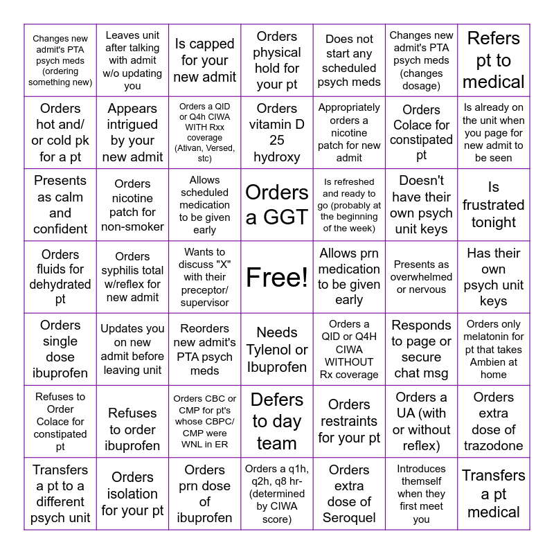 This bingo card has a free space and 55 words: Orders extra dose of Seroquel, Is frustrated tonight, Does not respond to page or secure chat msg, Changes new admit's PTA psych meds (ordering something new), Orders syphilis total w/reflex for new admit, Refuses to order ibuprofen, Refers pt to medical, Comes to assess new admit more than 3 hours after page, Appears intrigued by your new admit, Orders CBC or CMP for pt's whose CBPC/ CMP were WNL in ER, Orders physical hold for your pt, Orders only melatonin for pt that takes Ambien at home, Has their own psych unit keys, Presents as overwhelmed or nervous, Transfers a pt to a different psych unit, Orders single dose ibuprofen, Does not start any scheduled psych meds, Appropriately orders a nicotine patch for new admit, Introduces themself when they first meet you, Orders Colace for constipated pt, Is already on the unit when you page for new admit to be seen, Updates you on new admit before leaving unit, Is refreshed and ready to go (probably at the beginning of the week), Is capped for your new admit, Comes to assess new pt 2- 3 hours after page, Orders hot and/ or cold pk for a pt, Wants to discuss "X" with their preceptor/ supervisor, Asks if the new admit has a roommate, Presents as calm and confident, Doesn't have their own psych unit keys, Needs caffeine, Responds to page or secure chat msg, Orders extra dose of trazodone, Orders isolation for your pt, Changes new admit's PTA psych meds (changes dosage), Orders vitamin D 25 hydroxy, Refuses to Order Colace for constipated pt, Orders nicotine patch for non-smoker, Transfers a pt medical, Reorders new admit's PTA psych meds, Leaves unit after talking with admit w/o updating you, Defers to day team, Orders restraints for your pt, Comes to assess new admit within 30 minutes of page, Allows scheduled medication to be given early, Orders fluids for dehydrated pt, Orders prn dose of ibuprofen, Orders a QID or Q4H CIWA WITHOUT Rx coverage, Allows prn medication to be given early, Orders a QID or Q4h CIWA WITH Rxx coverage (Ativan, Versed, stc), Needs Tylenol or Ibuprofen, Orders a UA (with or without reflex), Orders a q1h, q2h, q8 hr- (determined by CIWA score), Orders a GGT and Orders Zofran.