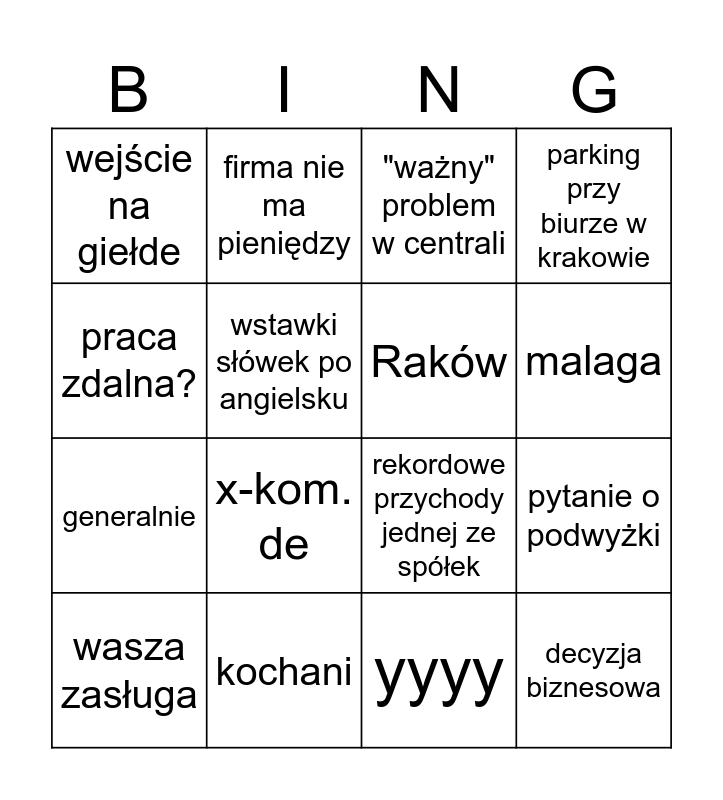 This bingo card has 16 words: kochani, pytanie o podwyżki, "ważny" problem w centrali, wejście na giełde, generalnie, firma nie ma pieniędzy, rekordowe przychody jednej ze spółek, yyyy, praca zdalna?, wstawki słówek po angielsku, wasza zasługa, parking przy biurze w krakowie, x-kom. de, malaga, Raków and decyzja biznesowa.