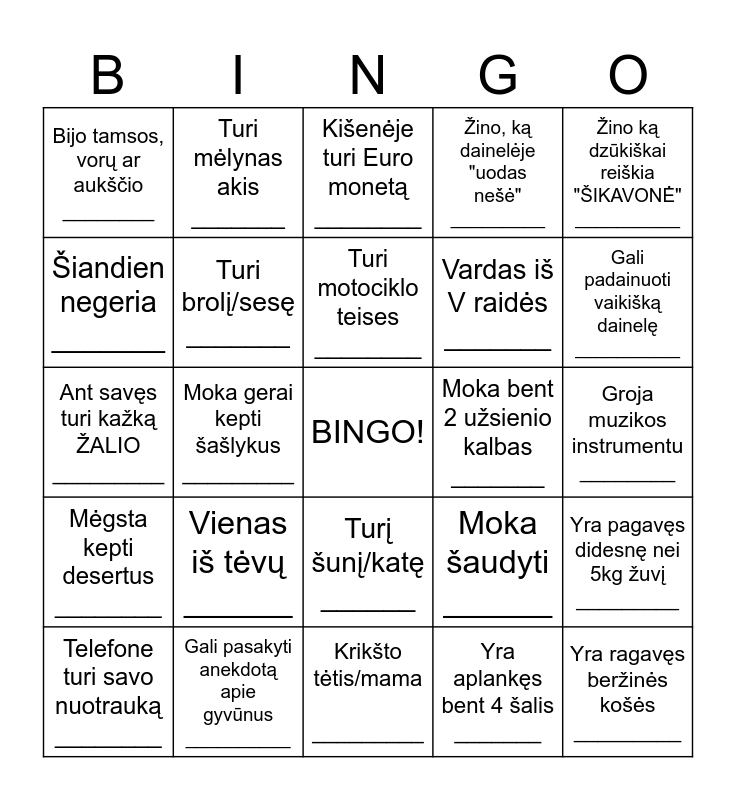 This bingo card has a free space and 24 words: Vienas iš tėvų ______, Gali pasakyti anekdotą apie gyvūnus __________, Turi motociklo teises ________, Telefone turi savo nuotrauką ________, Žino ką dzūkiškai reiškia "ŠIKAVONĖ" __________, Bijo tamsos, vorų ar aukščio ________, Šiandien negeria _______, Turi mėlynas akis _______, Moka bent 2 užsienio kalbas _______, Turį šunį/katę ______, Vardas iš V raidės _______, Ant savęs turi kažką ŽALIO _________, Moka šaudyti ______, Yra pagavęs didesnę nei 5kg žuvį _________, Turi brolį/sesę _______, Yra aplankęs bent 4 šalis _______, Groja muzikos instrumentu ________, Kišenėje turi Euro monetą ________, Gali padainuoti vaikišką dainelę __________, Moka gerai kepti šašlykus _________, Yra ragavęs beržinės košės _________, Mėgsta kepti desertus ________, Žino, ką dainelėje "uodas nešė" _________ and Krikšto tėtis/mama _________.