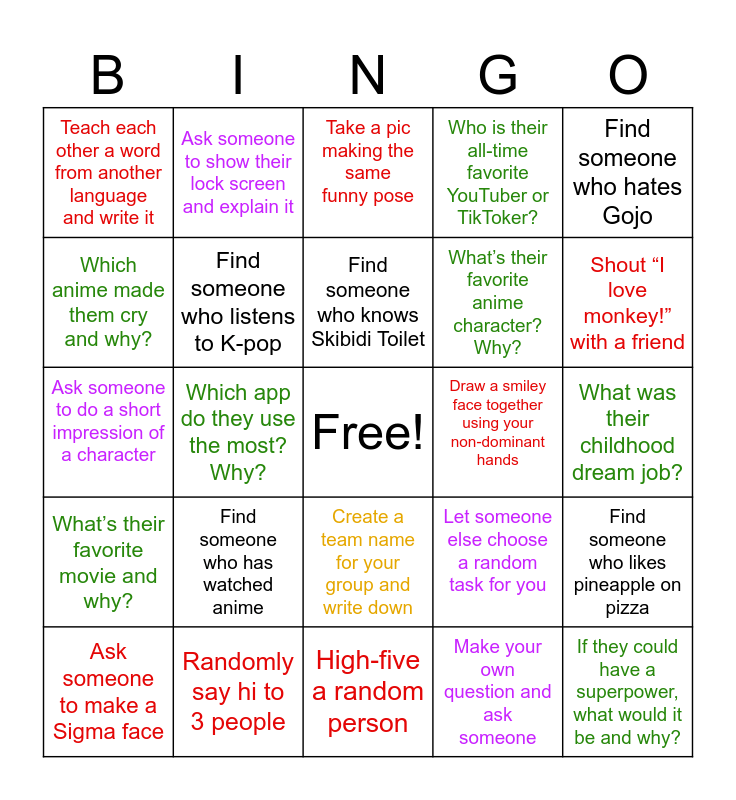 This bingo card has a free space and 38 words: Find someone who has a cat, Find someone who wears glasses, Find someone who’s left-handed, Find someone who listens to K-pop, Find someone who likes pineapple on pizza, Find someone who has watched anime, Find someone who knows Skibidi Toilet, Find someone who likes Gigachad, Find someone who hates Gojo, What’s their favorite anime character? Why?, Which app do they use the most? Why?, Who is their all-time favorite YouTuber or TikToker?, If they could have a superpower, what would it be and why?, What was their childhood dream job?, Which anime made them cry and why?, What’s their favorite movie and why?, Ask their favorite song and have them sing a part, Take a pic making the same funny pose, Say “sus” with a straight face to someone, Draw a smiley face together using your non-dominant hands, Teach each other a word from another language and write it, Randomly say hi to 3 people, Shout “I love monkey!” with a friend, Ask someone to make a Sigma face, Do a 3-second silly walk with someone, High-five a random person, Find 3 people who hate pineapple on pizza, Find a group of 3 who all play video games, Play rock-paper-scissors with 3npeople and winners, Sing a short song together with 2 others, Find 3 people who use different phone brands (Apple/Android/etc.), Create a team name for your group and write down, Make your own question and ask someone, Ask someone to show their lock screen and explain it, Ask someone to write their dream on a sticky note and share it, Let someone else choose a random task for you, Ask someone to do a short impression of a character and Ask someone to draw their favorite food from memory.