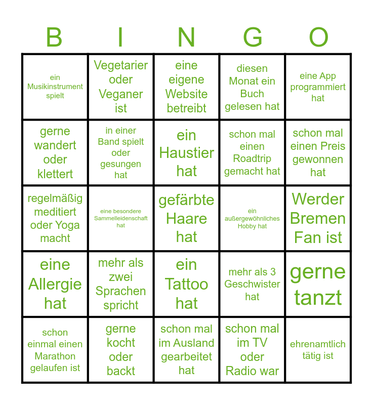 This bingo card has a free space and 24 words: mehr als zwei Sprachen spricht, gerne kocht oder backt, ein Haustier hat, schon einmal einen Marathon gelaufen ist, eine App programmiert hat, ein Musikinstrument spielt, gerne wandert oder klettert, Vegetarier oder Veganer ist, ein außergewöhnliches Hobby hat, ein Tattoo hat, schon mal einen Roadtrip gemacht hat, regelmäßig meditiert oder Yoga macht, mehr als 3 Geschwister hat, gerne tanzt, in einer Band spielt oder gesungen hat, schon mal im TV oder Radio war, Werder Bremen Fan ist, eine eigene Website betreibt, schon mal einen Preis gewonnen hat, eine besondere Sammelleidenschaft hat, ehrenamtlich tätig ist, eine Allergie hat, diesen Monat ein Buch gelesen hat and schon mal im Ausland gearbeitet hat.