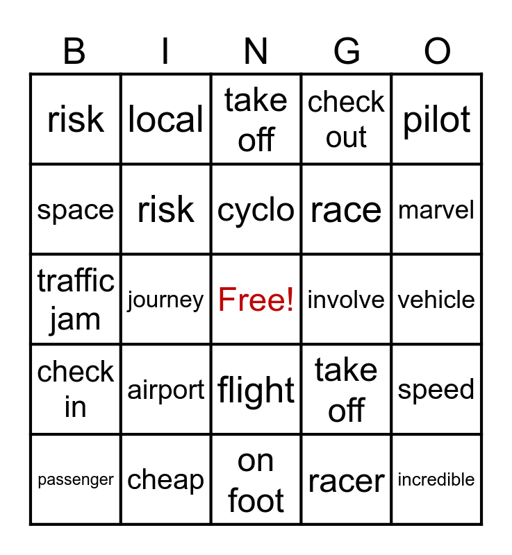 This bingo card has a free space and 24 words: airport, cheap, cyclo, passenger, pilot, risk, space, local, involve, flight, race, traffic jam, take off, speed, risk, racer, vehicle, take off, marvel, journey, incredible, check in, check out and on foot.