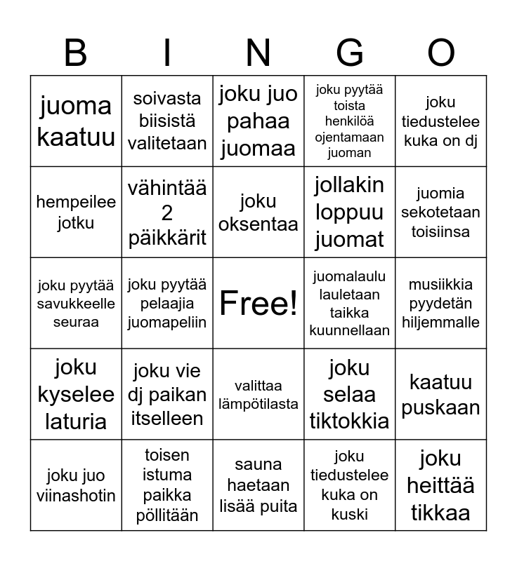 This bingo card has a free space and 24 words: joku vie dj paikan itselleen, toisen istuma paikka pöllitään, joku oksentaa, joku juo viinashotin, joku tiedustelee kuka on dj, juoma kaatuu, hempeilee jotku, soivasta biisistä valitetaan, juomalaulu lauletaan taikka kuunnellaan, valittaa lämpötilasta, jollakin loppuu juomat, joku pyytää savukkeelle seuraa, joku selaa tiktokkia, kaatuu puskaan, vähintää 2 päikkärit, joku tiedustelee kuka on kuski, musiikkia pyydetän hiljemmalle, joku juo pahaa juomaa, juomia sekotetaan toisiinsa, joku pyytää pelaajia juomapeliin, joku heittää tikkaa, joku kyselee laturia, joku pyytää toista henkilöä ojentamaan juoman and sauna haetaan lisää puita.