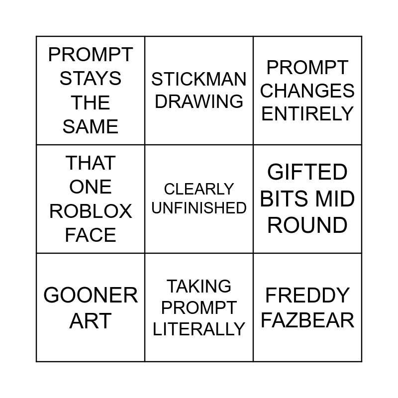 This bingo card has 22 words: FEET, MASTERPIECE, STICKMAN DRAWING, GIFTED SUBS MIDROUND, GIFTED BITS MID ROUND, GOONER ART, PROMPT STAYS THE SAME, PROMPT CHANGES ENTIRELY, ITALIAN BRAINROT, SPAMTOM, FREDDY FAZBEAR, THAT ONE ROBLOX FACE, MOGGING, SANS, SPOILS MEDIA, DISNEY CHARACTER, LEBRON JAMES, SAME PROMPT BETWEEN ALBUMS, ANIME REFERENCE, CLEARLY UNFINISHED, TAKING PROMPT LITERALLY and AN OC IS DRAWN.