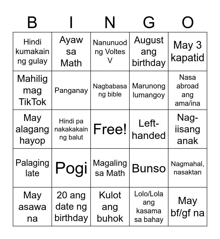 This bingo card has a free space and 26 words: Magaling sa Math, Lolo/Lola ang kasama sa bahay, Nagbabasa ng bible, 20 ang date ng birthday, May 3 kapatid, Hindi kumakain ng gulay, Mahilig mag TikTok, Ayaw sa Math, Nag-iisang anak, Bunso, Marunong lumangoy, May alagang hayop, Nagmahal, nasaktan, May asawa na, Hindi pa nakakakain ng balut, Hindi nagmumura, August ang birthday, Palaging late, Nanunuod ng Voltes V, May bf/gf na, Nasa abroad ang ama/ina, Kulot ang buhok, Left-handed, Pogi, Panganay and Memorized ang pambansang awit.
