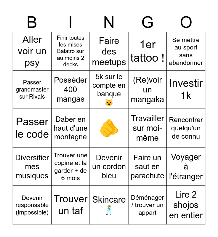 This bingo card has a free space and 24 words: Trouver une copine et la garder + de 6 mois, Trouver un taf, 5k sur le compte en banque 😼, Devenir responsable (impossible), Se mettre au sport sans abandonner, Aller voir un psy, Passer grandmaster sur Rivals, Finir toutes les mises Balatro sur au moins 2 decks, Travailler sur moi-même, Devenir un cordon bleu, (Re)voir un mangaka, Passer le code, Faire un saut en parachute, Voyager à l'étranger, Posséder 400 mangas, Déménager / trouver un appart, Rencontrer quelqu'un de connu, Faire des meetups, Investir 1k, Daber en haut d'une montagne, Lire 2 shojos en entier, Diversifier mes musiques, 1er tattoo ! and Skincare 🕺.
