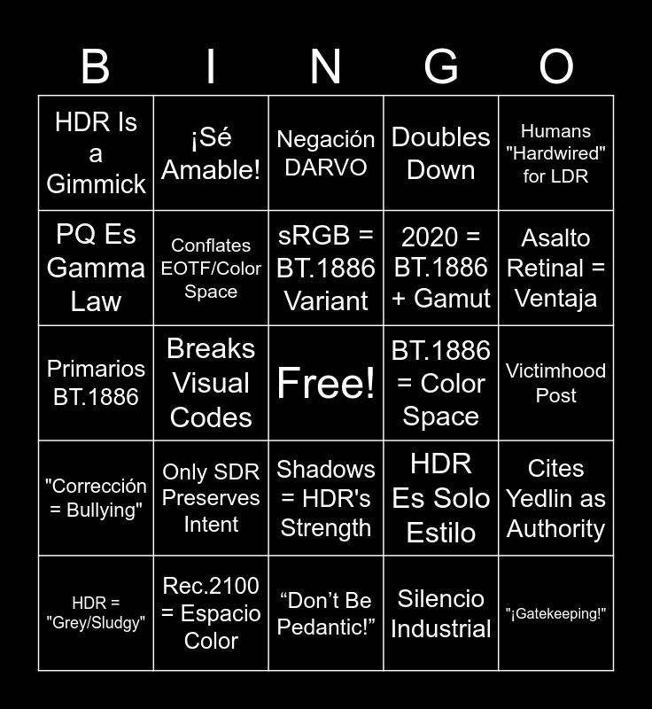 This bingo card has a free space and 24 words: Only SDR Preserves Intent, Rec.2100 = Espacio Color, sRGB = BT.1886 Variant, HDR = "Grey/Sludgy", Humans "Hardwired" for LDR, HDR Is a Gimmick, PQ Es Gamma Law, ¡Sé Amable!, BT.1886 = Color Space, Shadows = HDR's Strength, 2020 = BT.1886 + Gamut, Primarios BT.1886, HDR Es Solo Estilo, Cites Yedlin as Authority, Conflates EOTF/Color Space, Silencio Industrial, Victimhood Post, Negación DARVO, Asalto Retinal = Ventaja, Breaks Visual Codes, "¡Gatekeeping!", "Corrección = Bullying", Doubles Down and “Don’t Be Pedantic!”.