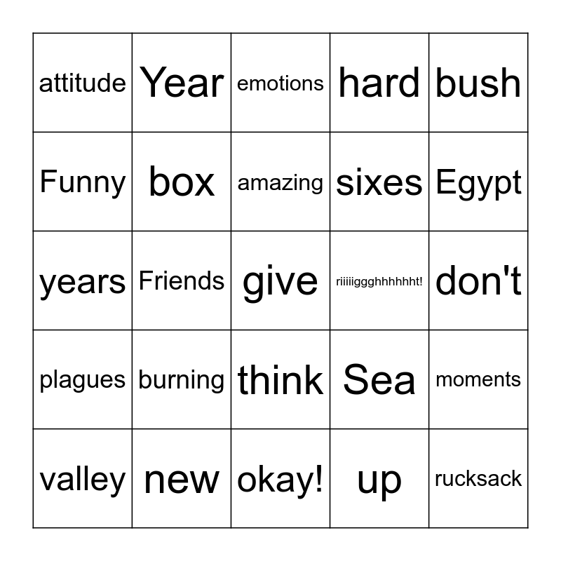This bingo card has 30 words: new, adventure, Friends, Moses, attitude, emotions, box, think, riiiiiggghhhhhht!, okay!, don't, give, up, rucksack, Egypt, Red, Sea, plagues, burning, bush, years, desert, Year, sixes, Funny, hard, moments, valley, amazing and family.