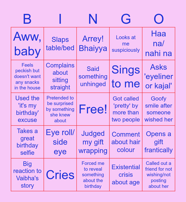 This bingo card has a free space and 24 words: Eye roll/ side eye, Cries, Said something unhinged, Big reaction to Vaibha's story, Haa na/ nahi na, Aww, baby, Feels peckish but doesn't want any snacks in the house, Slaps table/bed, Got called 'pretty' by more than two people, Judged my gift wrapping, Sings to me, Used the 'it's my birthday' excuse, Comment about hair colour, Opens a gift frantically, Complains about sitting straight, Existential crisis about age, Goofy smile after someone wished her, Arrey! Bhaiyya, Asks 'eyeliner or kajal', Pretended to be surprised by something she knew about, Called out a friend for not wishing/not posting about her, Takes a great birthday selfie, Looks at me suspiciously and Forced me to reveal something about the birthday.