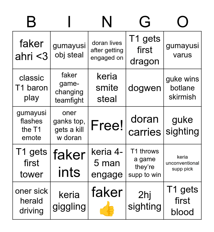 This bingo card has a free space and 24 words: faker ints, keria giggling, keria smite steal, oner sick herald driving, gumayusi varus, faker ahri <3, classic T1 baron play, gumayusi obj steal, doran carries, keria 4-5 man engage, dogwen, gumayusi flashes the T1 emote, T1 throws a game they’re supp to win, keria unconventional supp pick, faker game-changing teamfight, 2hj sighting, guke sighting, doran lives after getting engaged on, guke wins botlane skirmish, oner ganks top, gets a kill w doran, T1 gets first blood, T1 gets first tower, T1 gets first dragon and faker 👍.