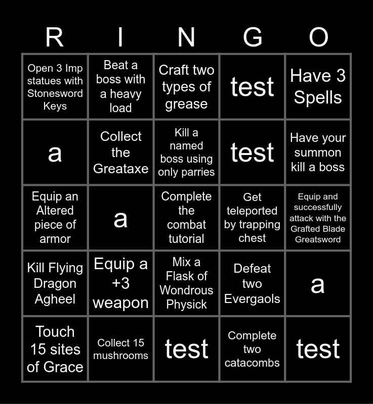 This bingo card has a free space and 34 words: Duplicate a Boss Remembrance, Complete two catacombs, Have 25 Faith, Hug Fia, Kill Flying Dragon Agheel, Collect the Greataxe, Have 3 Spells, Touch 15 sites of Grace, Beat a boss with a heavy load, Talk to Blaidd, Kill a named boss using only parries, Craft two types of grease, Kill NPC invader, Defeat an Erdtree Avatar, Get teleported by trapping chest, Have your summon kill a boss, Collect 15 mushrooms, Equip an Altered piece of armor, Equip a +3 weapon, Defeat two Evergaols, Mix a Flask of Wondrous Physick, Have 50,000 Runes on you, Open 3 Imp statues with Stonesword Keys, Equip and successfully attack with the Grafted Blade Greatsword, test, test, test, test, test, a, a, a, a and a.