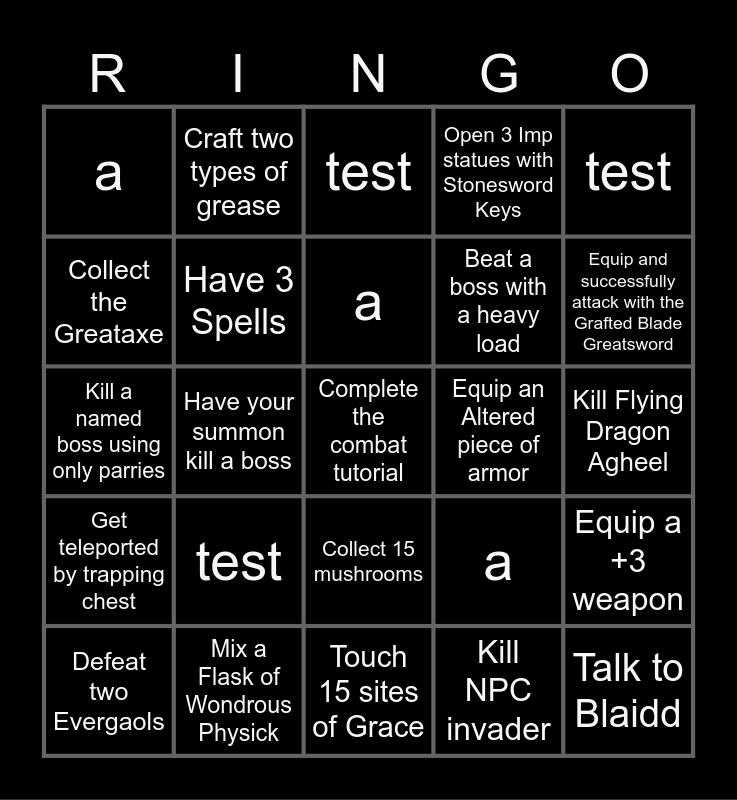 This bingo card has a free space and 34 words: Duplicate a Boss Remembrance, Complete two catacombs, Have 25 Faith, Hug Fia, Kill Flying Dragon Agheel, Collect the Greataxe, Have 3 Spells, Touch 15 sites of Grace, Beat a boss with a heavy load, Talk to Blaidd, Kill a named boss using only parries, Craft two types of grease, Kill NPC invader, Defeat an Erdtree Avatar, Get teleported by trapping chest, Have your summon kill a boss, Collect 15 mushrooms, Equip an Altered piece of armor, Equip a +3 weapon, Defeat two Evergaols, Mix a Flask of Wondrous Physick, Have 50,000 Runes on you, Open 3 Imp statues with Stonesword Keys, Equip and successfully attack with the Grafted Blade Greatsword, test, test, test, test, test, a, a, a, a and a.