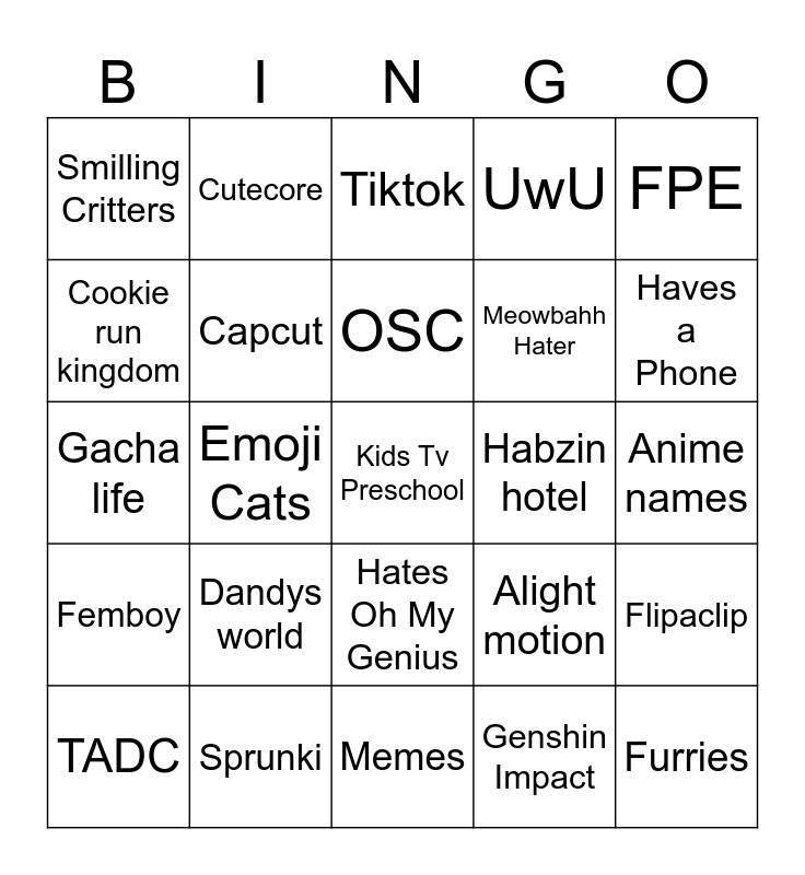 This bingo card has a free space and 24 words: Dandys world, Sprunki, OSC, TADC, FPE, Smilling Critters, Cookie run kingdom, Cutecore, Habzin hotel, Hates Oh My Genius, Meowbahh Hater, Gacha life, Alight motion, Flipaclip, Capcut, Genshin Impact, Anime names, Tiktok, Haves a Phone, Emoji Cats, Furries, Femboy, UwU and Memes.