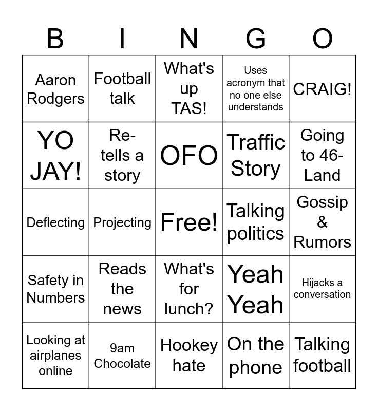 This bingo card has a free space and 24 words: Reads the news, 9am Chocolate, OFO, Looking at airplanes online, CRAIG!, Aaron Rodgers, YO JAY!, Football talk, Talking politics, What's for lunch?, Traffic Story, Deflecting, Yeah Yeah, Hijacks a conversation, Re-tells a story, On the phone, Gossip & Rumors, What's up TAS!, Going to 46- Land, Projecting, Talking football, Safety in Numbers, Uses acronym that no one else understands and Hookey hate.