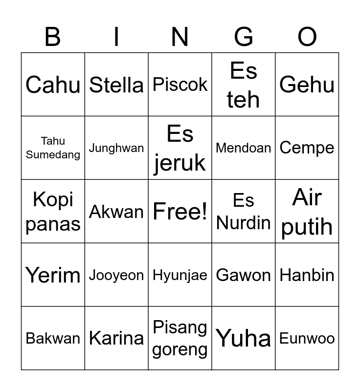 This bingo card has a free space and 24 words: Jooyeon, Karina, Es jeruk, Bakwan, Gehu, Cahu, Tahu Sumedang, Stella, Es Nurdin, Hyunjae, Mendoan, Kopi panas, Gawon, Hanbin, Junghwan, Yuha, Air putih, Piscok, Cempe, Akwan, Eunwoo, Yerim, Es teh and Pisang goreng.