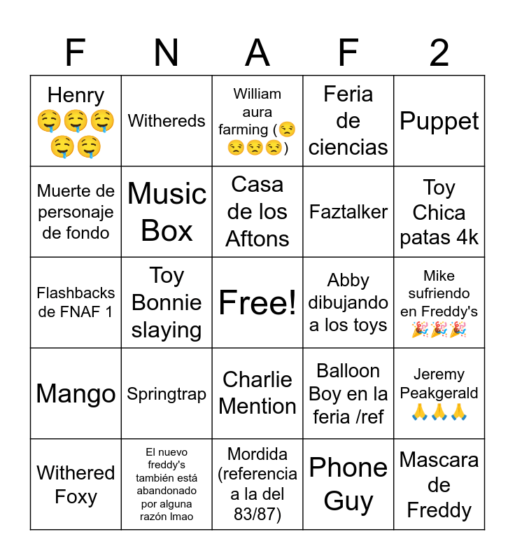 This bingo card has a free space and 24 words: Springtrap, El nuevo freddy's también está abandonado por alguna razón lmao, Casa de los Aftons, Withered Foxy, Puppet, Henry 🤤🤤🤤🤤🤤, Muerte de personaje de fondo, Withereds, Abby dibujando a los toys, Charlie Mention, Faztalker, Flashbacks de FNAF 1, Balloon Boy en la feria /ref, Jeremy Peakgerald🙏🙏🙏, Music Box, Phone Guy, Mike sufriendo en Freddy's 🎉🎉🎉, William aura farming (😒😒😒😒), Toy Chica patas 4k, Toy Bonnie slaying, Mascara de Freddy, Mango, Feria de ciencias and Mordida (referencia a la del 83/87).