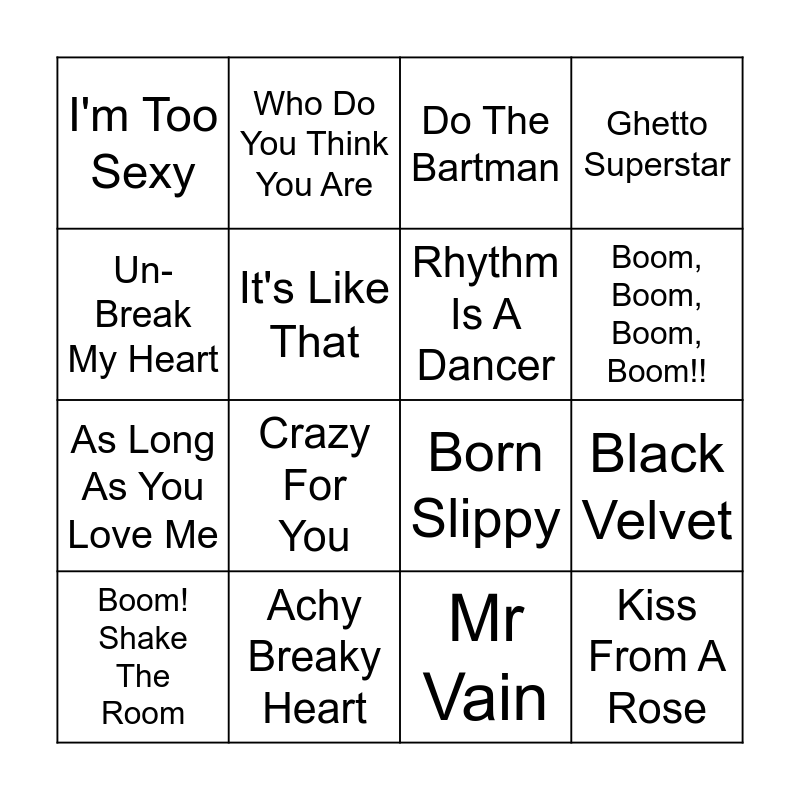 This bingo card has 30 words: See You On The Other Side, The Joker, Black Velvet, The One And Only, I'm Too Sexy, Do The Bartman, Rhythm Is A Dancer, My Girl, Achy Breaky Heart, No Limit, Mr Vain, Boom! Shake The Room, Baby Come Back, Always, Crazy For You, Don't Stop (Wiggle Wiggle), Never Forget, Kiss From A Rose, Spaceman, Un-Break My Heart, Born Slippy, Where Do You Go, Who Do You Think You Are, As Long As You Love Me, It's Like That, Ghetto Superstar, Angels, Genie In A Bottle, Boom, Boom, Boom, Boom!! and Bring It All Back.