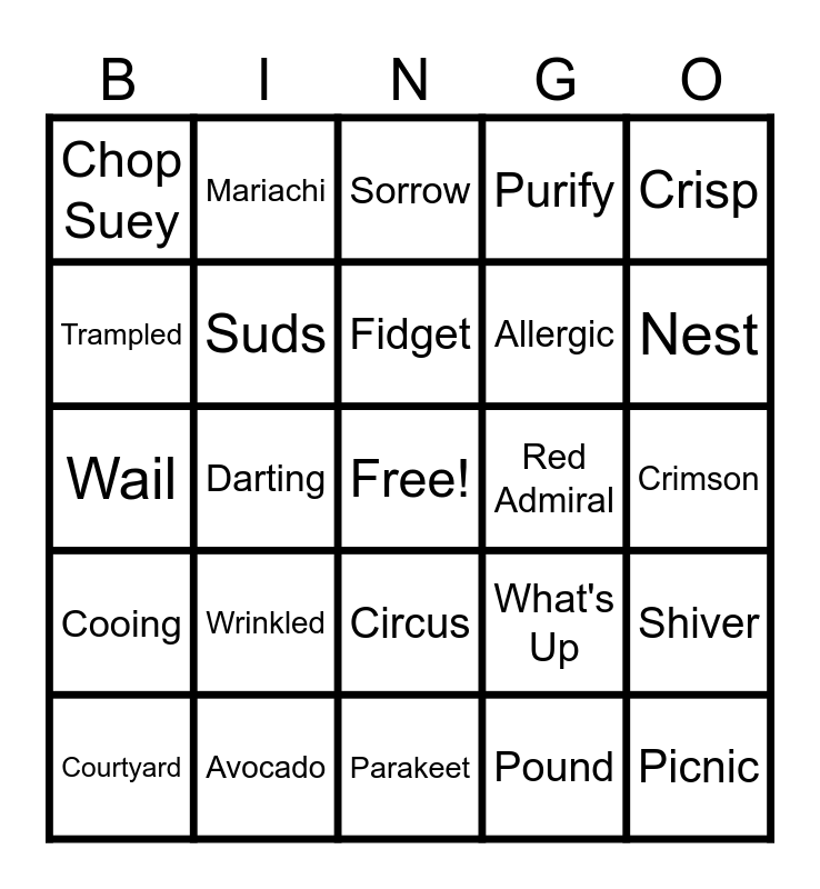 This bingo card has a free space and 30 words: Avocado, Thrill, Darting, Soared, Chop Suey, Sorrow, Suds, Circus, Red Admiral, Parakeet, Crimson, Picnic, Pound, Village, Nest, Frantic, What's Up, Cooing, Wrinkled, Crisp, Wail, Suddenly, Mariachi, Allergic, Trampled, Purify, Shiver, Courtyard, Fidget and Station Wagon.