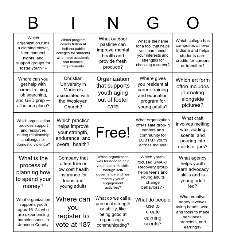 This bingo card has a free space and 24 words: Company that offers free or low cost health insurance for teens and young adults, Where can you register to vote at 18?, Organization that supports youth aging out of foster care, What organization supports youth ages 16–24 who are experiencing homelessness in Johnson County, Which college has campuses all over Indiana and helps students earn credits for careers or transfers?, Which organization runs a clothing closet, teen connect nights, and support groups for foster youth? -, Where can you get help with career training, job searching, and GED prep — all in one place?, Which program covers tuition at Indiana public colleges for students who meet academic and financial requirements, What organization offers safe drop-in centers and community for LGBTQ+ youth across Indiana, Which organization was founded to help youth learn life skills through self-governance and has monthly youth engagement activities?, Where gives you residential career training and education program for young adults?, Which organization provides support and resources during relationship challenges or domestic violence?, Which youth-focused SMART Recovery group helps teens and young adults change behaviors? -, What agency helps youth learn advocacy skills and is young adult led?, Christian University in Marion is associated with the Wesleyan Church?, What do people use to create calming scents?, What craft involves melting wax, adding scents, and pouring into molds or jars?, What outdoor pastime can improve mental health and provide fresh produce?, Which art form often includes journaling alongside pictures?, Which practice helps improve your strength, endurance, and overall health?, What creative hobby involves using beads, wire, and tools to make necklaces, bracelets, and earrings?, What is the process of planning how to spend your money?, What is the name for a tool that helps you learn about your interests and strengths for choosing a career? and What do we call a personal strength or ability, like being good at organizing or communicating?.