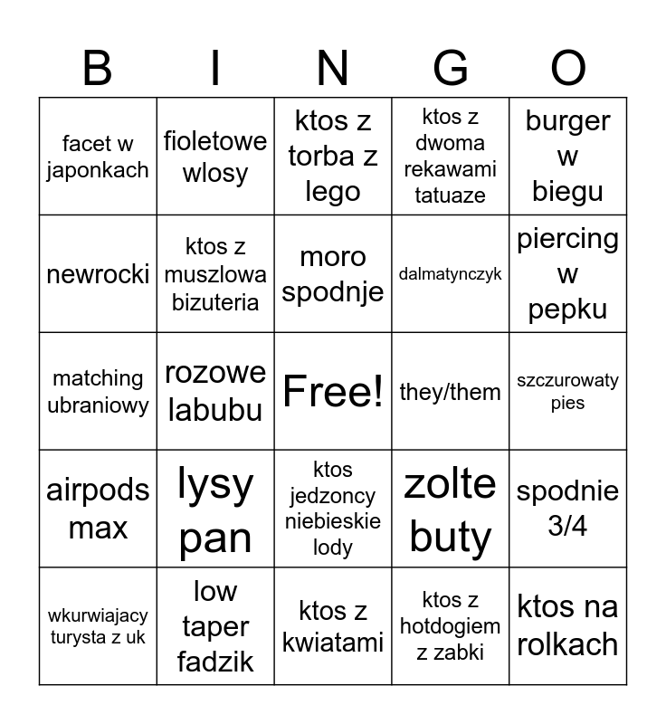 This bingo card has a free space and 24 words: lysy pan, low taper fadzik, moro spodnje, wkurwiajacy turysta z uk, burger w biegu, facet w japonkach, newrocki, fioletowe wlosy, they/them, ktos jedzoncy niebieskie lody, dalmatynczyk, matching ubraniowy, zolte buty, spodnie 3/4, ktos z muszlowa bizuteria, ktos z hotdogiem z zabki, szczurowaty pies, ktos z torba z lego, piercing w pepku, rozowe labubu, ktos na rolkach, airpods max, ktos z dwoma rekawami tatuaze and ktos z kwiatami.