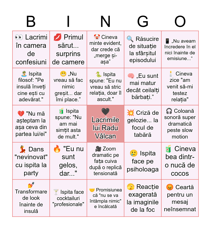 This bingo card has a free space and 24 words: 🔥 "Eu nu sunt gelos, dar...", 🍸 Ispita face cocktailuri "profesionale", 🐍 Ispita spune: "Eu nu vreau să stric relația, doar îl ascult.", 💅 Transformare de look înainte de insulă, 📱 „Nu aveam încredere în el nici înainte de emisiune...”, 👀 Lacrimi în camera de confesiuni, 🏝️ Ispita filosof: "Pe insulă înveți cine ești cu adevărat.", 💋 Primul sărut... surprins de camere, 💥 Criză de gelozie... la focul de tabără, 🎥 Zoom dramatic pe fața cuiva după o replică tensionată, 🧠 „Eu sunt mai matur decât ceilalți bărbați.”, 💔 "Nu mă așteptam la așa ceva din partea lui/ei", 🥲 Ispita face pe psiholoaga, 🧃 Cineva bea dintr-o nucă de cocos, 😬 „Nu vreau să fac nimic greșit... dar îmi place.”, 🫣 Reacție exagerată la imaginile de la foc, 🎧 Coloană sonoră super dramatică peste slow motion, 🤡 Cineva minte evident, dar crede că „merge și-așa”, 🕯️ Cineva zice "am venit să-mi testez relația", 🧃 Ispita spune: "Nu am mai simțit asta de mult.", 😡 Ceartă pentru un mesaj neînsemnat, 💃 Dans "nevinovat" cu ispita la party, 🔍 Răsucire de situație la sfârșitul episodului and 🤝 Promisiunea că "nu se va întâmpla nimic" e încălcată.