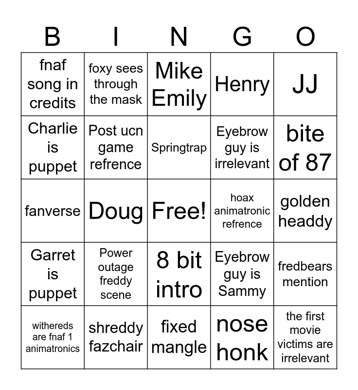 This bingo card has a free space and 37 words: The toys are possesed, Markiplier, Other youtuber, Post ucn game refrence, fredbears mention, Power outage freddy scene, Springtrap, Afton is only in flashbacks, JJ, Shadow bonnie, Doug, Henry, the first movie victims are irrelevant, golden headdy, Charlie is puppet, Garret is puppet, Mike Afton, Mike Emily, 8 bit intro, hoax animatronic refrence, fnaf song in credits, bite of 87, withereds are fnaf 1 animatronics, fixed mangle, the first movie victims are relevant, nose honk, foxy sees through the mask, bb steals batteries, gameplay refrence, mangle gender, Skeet Ulrich plays Henry, shreddy fazchair, fanverse, book refrence, Eyebrow guy is Sammy, Eyebrow guy is irrelevant and Eyebrow guy is Mike Afton.