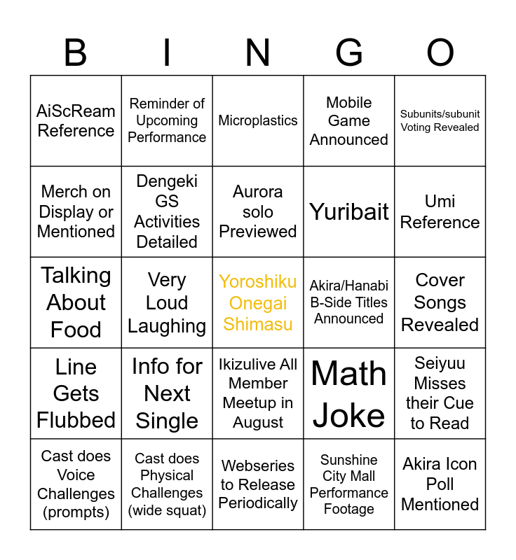 This bingo card has a free space and 24 words: Info for Next Single, Cast does Physical Challenges (wide squat), Aurora solo Previewed, Cast does Voice Challenges (prompts), Subunits/subunit Voting Revealed, AiScReam Reference, Merch on Display or Mentioned, Reminder of Upcoming Performance, Akira/Hanabi B-Side Titles Announced, Ikizulive All Member Meetup in August, Yuribait, Talking About Food, Math Joke, Seiyuu Misses their Cue to Read, Dengeki GS Activities Detailed, Sunshine City Mall Performance Footage, Cover Songs Revealed, Microplastics, Umi Reference, Very Loud Laughing, Akira Icon Poll Mentioned, Line Gets Flubbed, Mobile Game Announced and Webseries to Release Periodically.