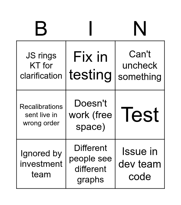 This bingo card has a free space and 8 words: Test, Can't uncheck something, Fix in testing, Ignored by investment team, JS rings KT for clarification, Issue in dev team code, Recalibrations sent live in wrong order and Different people see different graphs.