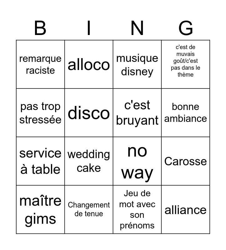 This bingo card has 16 words: Changement de tenue, Carosse, musique disney, remarque raciste, service à table, alloco, no way, Jeu de mot avec son prénoms, pas trop stressée, disco, maître gims, c'est de muvais goût/c'est pas dans le thème, wedding cake, bonne ambiance, c'est bruyant and alliance.