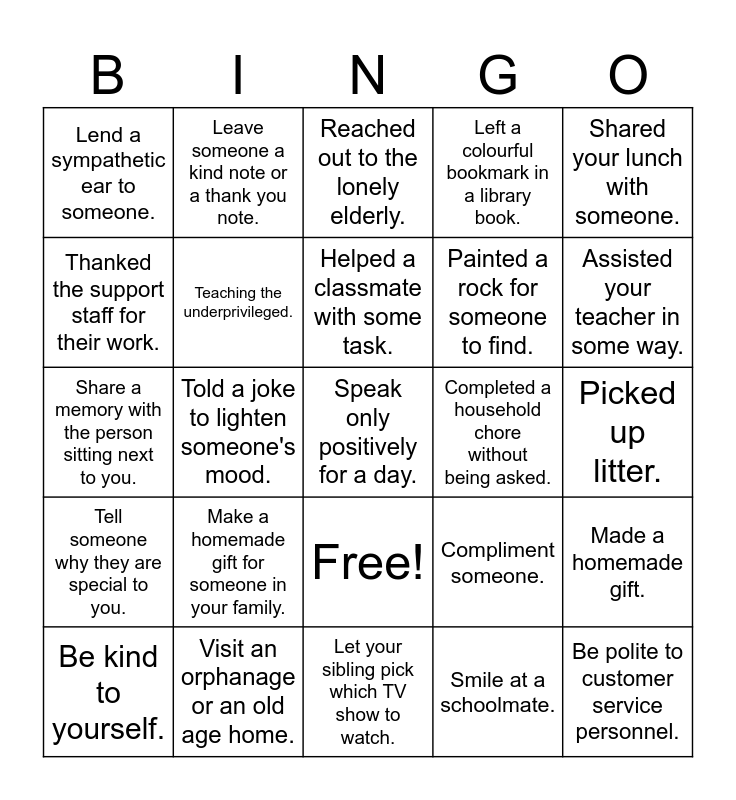This bingo card has 26 words: Free!, Smile at a schoolmate., Helped a classmate with some task., Visit an orphanage or an old age home., Shared your lunch with someone., Lend a sympathetic ear to someone., Thanked the support staff for their work., Leave someone a kind note or a thank you note., Picked up litter., Compliment someone., Painted a rock for someone to find., Share a memory with the person sitting next to you., Made a homemade gift., Be kind to yourself., Told a joke to lighten someone's mood., Feed birds / stray animals., Left a colourful bookmark in a library book., Tell someone why they are special to you., Reached out to the lonely elderly., Speak only positively for a day., Assisted your teacher in some way., Let your sibling pick which TV show to watch., Completed a household chore without being asked., Make a homemade gift for someone in your family., Teaching the underprivileged. and Be polite to customer service personnel..