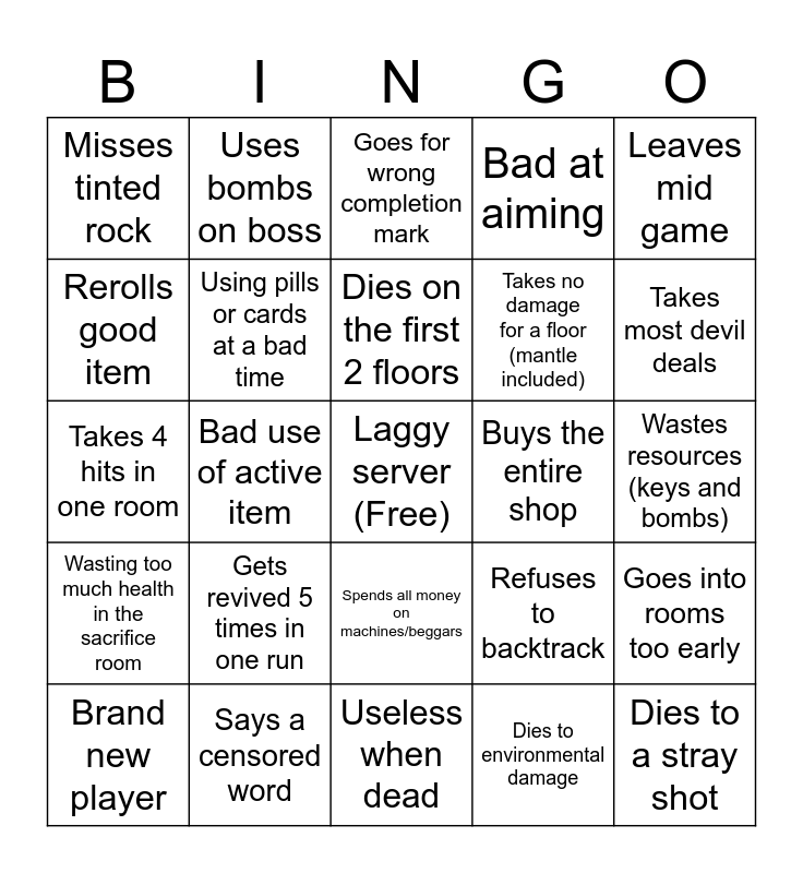 This bingo card has a free space and 34 words: Kills self or teammate, Dies to environmental damage, Takes a really bad item, Plays with a bad character, Wasting too much health in the sacrifice room, Using pills or cards at a bad time, Leaves mid game, Brand new player, Uses bombs on boss, No hits boss, Dies on the first 2 floors, Goes for wrong completion mark, Steals most items, Steals most health, Buys the entire shop, Takes most devil deals, Says a censored word, Takes 4 hits in one room, Gets revived 5 times in one run, Refuses to backtrack, Spends all money on machines/beggars, Rage quit, Misses tinted rock, Wastes resources (keys and bombs), Useless when dead, Dies to a stray shot, Bad at aiming, Intentionally tanking, Takes no damage for a floor (mantle included), Rerolls good item, Starts game before people pick character, Bad use of active item, Goes into rooms too early and Barely doing anything to help team.