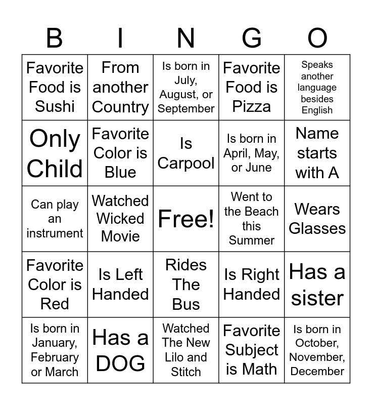 This bingo card has a free space and 24 words: Is Left Handed, Has a DOG, Is Carpool, Is born in January, February or March, Speaks another language besides English, Favorite Food is Sushi, Only Child, From another Country, Went to the Beach this Summer, Rides The Bus, Is born in April, May, or June, Can play an instrument, Is Right Handed, Has a sister, Favorite Color is Blue, Favorite Subject is Math, Wears Glasses, Is born in July, August, or September, Name starts with A, Watched Wicked Movie, Is born in October, November, December, Favorite Color is Red, Favorite Food is Pizza and Watched The New Lilo and Stitch.