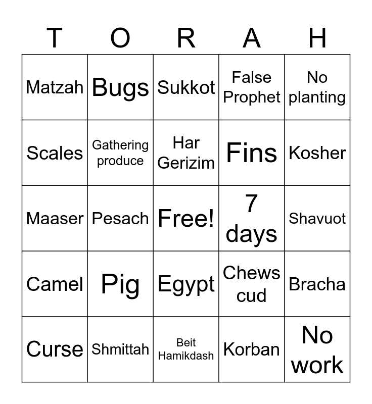 This bingo card has a free space and 30 words: Shmittah, Firstborn, Pesach, No Chametz, Matzah, Sukkot, Gathering produce, Egypt, 7 days, Beit Hamikdash, Shavuot, No work, Korban, Spring, Kosher, Split Hooves, Chews cud, Camel, Pig, No planting, Maaser, Birds, Bugs, Fins, Scales, False Prophet, Bracha, Curse, Har Gerizim and Har Eival.
