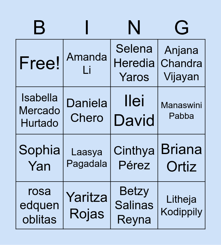 This bingo card has 16 words: rosa edquen oblitas, Yaritza Rojas, Selena Heredia Yaros, Anjana Chandra Vijayan, Isabella Mercado Hurtado, Amanda Li, Cinthya Pérez, Briana Ortiz, Free!, Daniela Chero, Betzy Salinas Reyna, Manaswini Pabba, Sophia Yan, Laasya Pagadala, Ilei David and Litheja Kodippily.