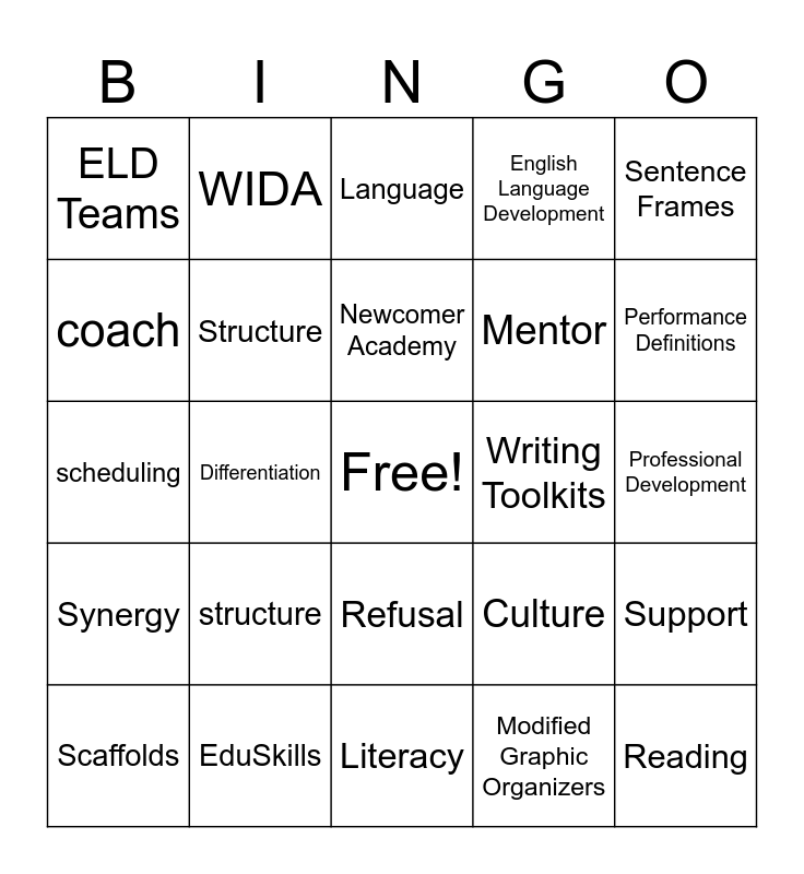 This bingo card has a free space and 55 words: Advocate, Scaffolds, Building Background Knowledge, ELD Teams, Literacy, Multilingual Learners, Structure, Collaborative Conversations, Mentor, Listening, English Language Development, Visuals, Small Groups, Accommodations, Speaking, Key Strategies, Sentence Frames, Differentiation, Curriculum, Reading, Writing Toolkits, Learning by Doing, Culture, Language, Writing, Newcomer Academy, Modified Graphic Organizers, Leadership, Professional Development, Support, Collaboration, Direct Vocab. Instruction, Planning, Proficiency Levels, coach, scheduling, BrainPop, Synergy, discourse, ELD Playbook, WIDA, Language Forms, Canvas, Language Analysis, structure, EduSkills, Linguistic Support, scaffolds, schedule, Performance Definitions, Key Language Use, Enrollment & Testing, Rubric, Refusal and Informal observation.