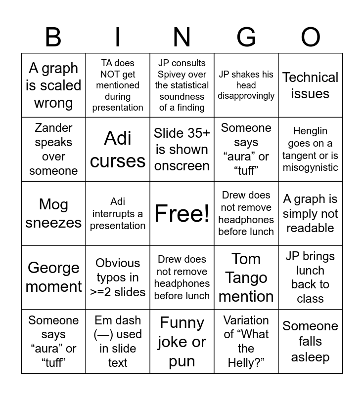 This bingo card has a free space and 154 words: JP cuts off a presentation, Ryan Brill mention, Tom Tango mention, Guest speaker namedropped, Someone falls asleep, Student or TA starts playing games on their phone/laptop, Adi unbuttons shirt, Adi interrupts a presentation, Adi curses, A group doesn’t know how to interpret a plot, Adi calls BS on a plot/finding, Groups edit slides during other presentations, Someone says “aura” or “tuff”, A graph is scaled wrong, A graph is simply not readable, Technical issues, Someone reads notes off a phone, Mog sneezes, A TA is shouted out during a presentation, JP is chanted across the room, Drew pulls up Netflix!!, Adam admonishes soccer group, “We can/should look into that” in response to a question, Mog complains about exhaustion, TA speaks up to defend a group, Zander speaks over someone, Variation of “What the Helly?”, George moment, Student blames TA for mistake, Default R settings plot, Quotebook moment, TA starts crashing out while their group presents, Rita eye twitch, Tianshu asks a PhD-level question, Slide 35+ is shown onscreen, Group starts talking unintelligibly to fit in their slides, JP consults Spivey over the statistical soundness of a finding, Totally incorrect interpretation of a p-value, Student forget which slide is theirs, Student says “like” more than actual words, Funny joke or pun, Only one student actually talks, Drew does not remove headphones before lunch, Student asks to continue after JP cutoff, Meteor strikes G60, Spurious applause during Kenny/Mog, A graph has meaningless coloring, Student completely misunderstands a question, Adi learns something new about sports, Someone shows a finding where causation = correlation, >= 10 seconds of silence in a presentation (with no tech issues), Henglin goes on a tangent or is misogynistic, Loud clapping mid presentation, Sports not covered by any groups mentioned, JP shakes his head disapprovingly, George asks random TA for help, Adi can’t understand/hear what someone is saying, Group gets compliment from TA, TA playing poker, Student makes misogynistic comment, TA does NOT get mentioned during presentation, Student talks back to Adi, JP brings lunch back to class, Morning session ends after 12:15 pm, JP wearing PJS or groutfit, Someone trips or falls, Obvious typos in >=2 slides, ChatGPT’ed presentation/writing, Graph/Output actually says opposite of what the kids say it does, Coding language that is not R or Python mentioned, Natural language that is not English spoken during a presentation, A single TA asks more than two questions to a group, Em dash (—) used in slide text, Group starts lightly arguing/fighting during own presentation, 3 or more graphs shown on one slide, Paragraph on a slide, Victoria ghost name mentioned, JP cuts off a presentation, Ryan Brill mention, Tom Tango mention, Guest speaker namedropped, Someone falls asleep, Student or TA starts playing games on their phone/laptop, Adi unbuttons shirt, Adi interrupts a presentation, Adi curses, A group doesn’t know how to interpret a plot, Adi calls BS on a plot/finding, Groups edit slides during other presentations, Someone says “aura” or “tuff”, A graph is scaled wrong, A graph is simply not readable, Technical issues, Someone reads notes off a phone, Mog sneezes, A TA is shouted out during a presentation, JP is chanted across the room, Drew pulls up Netflix!!, Adam admonishes soccer group, “We can/should look into that” in response to a question, Mog complains about exhaustion, TA speaks up to defend a group, Zander speaks over someone, Variation of “What the Helly?”, George moment, Student blames TA for mistake, Default R settings plot, Quotebook moment, TA starts crashing out while their group presents, Rita eye twitch, Tianshu asks a PhD-level question, Slide 35+ is shown onscreen, Group starts talking unintelligibly to fit in their slides, JP consults Spivey over the statistical soundness of a finding, Totally incorrect interpretation of a p-value, Student forget which slide is theirs, Student says “like” more than actual words, Funny joke or pun, Only one student actually talks, Drew does not remove headphones before lunch, Student asks to continue after JP cutoff, Meteor strikes G60, Spurious applause during Kenny/Mog, A graph has meaningless coloring, Student completely misunderstands a question, Adi learns something new about sports, Someone shows a finding where causation = correlation, >= 10 seconds of silence in a presentation (with no tech issues), Henglin goes on a tangent or is misogynistic, Loud clapping mid presentation, Sports not covered by any groups mentioned, JP shakes his head disapprovingly, George asks random TA for help, Adi can’t understand/hear what someone is saying, Group gets compliment from TA, TA playing poker, Student makes misogynistic comment, TA does NOT get mentioned during presentation, Student talks back to Adi/JP, JP brings lunch back to class, Morning session ends after 12:15 pm, JP wearing PJS or groutfit, Someone trips or falls, Obvious typos in >=2 slides, ChatGPT’ed presentation/writing, Graph/Output actually says opposite of what the kids say it does, Coding language that is not R or Python mentioned, Natural language that is not English spoken during a presentation, A single TA asks more than two questions to a group, Em dash (—) used in slide text, Group starts lightly arguing/fighting during own presentation, 3 or more graphs shown on one slide, Paragraph on a slide and Victoria ghost name mentioned.