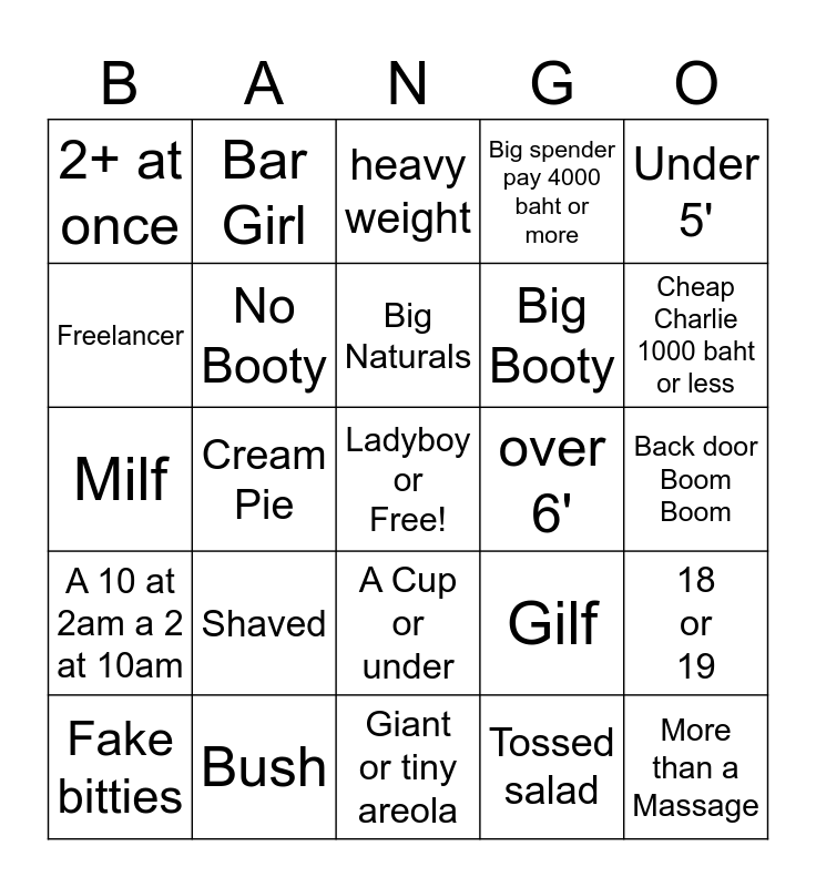 This bingo card has a free space and 24 words: Shaved, Bush, Big Naturals, Fake bitties, Under 5', 2+ at once, Freelancer, Bar Girl, over 6', A Cup or under, Big Booty, Milf, Gilf, 18 or 19, No Booty, Tossed salad, Back door Boom Boom, heavy weight, Cheap Charlie 1000 baht or less, Cream Pie, More than a Massage, A 10 at 2am a 2 at 10am, Big spender pay 4000 baht or more and Giant or tiny areola.