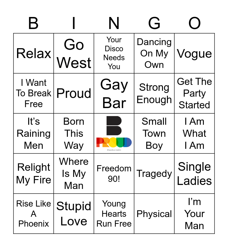 This bingo card has a free space and 49 words: Tell It To My Heart, Sissy That Walk, This Time I Know It’s For Real, Physical, I Am What I Am, Tainted Love, Go West, Gimme Gimme Gimme, Strong Enough, And I Am Telling You, I Want To Break Free, Born This Way, Tragedy, I’m Your Man, It’s A Sin, In Private, Your Disco Needs You, Small Town Boy, You Need To Calm Down, Relax, Stupid Love, Young Hearts Run Free, Dancing On My Own, Vogue, No More Tears, Where Is My Man, Gay Bar, Montero (Call Me By Your Name), Single Ladies, Relight My Fire, All The Things She Said, Freedom 90!, Free Your Mind, We Found Love, Rise Like A Phoenix, She Bop, I’m Too Sexy, Blue Monday, Get The Party Started, Let’s Have A Kiki, Groove Is In The Heart, If, People Like Us, I Love The Nightlife, It’s Raining Men, Proud, Everyone Is Gay, Ice Cream Truck and I Like Boys.