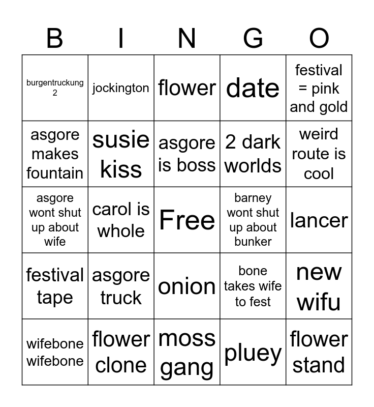 This bingo card has a free space and 24 words: asgore truck, flower clone, asgore is boss, wifebone wifebone, festival = pink and gold, burgentruckung 2, asgore makes fountain, jockington, barney wont shut up about bunker, onion, 2 dark worlds, asgore wont shut up about wife, bone takes wife to fest, new wifu, susie kiss, pluey, lancer, flower, weird route is cool, carol is whole, flower stand, festival tape, date and moss gang.