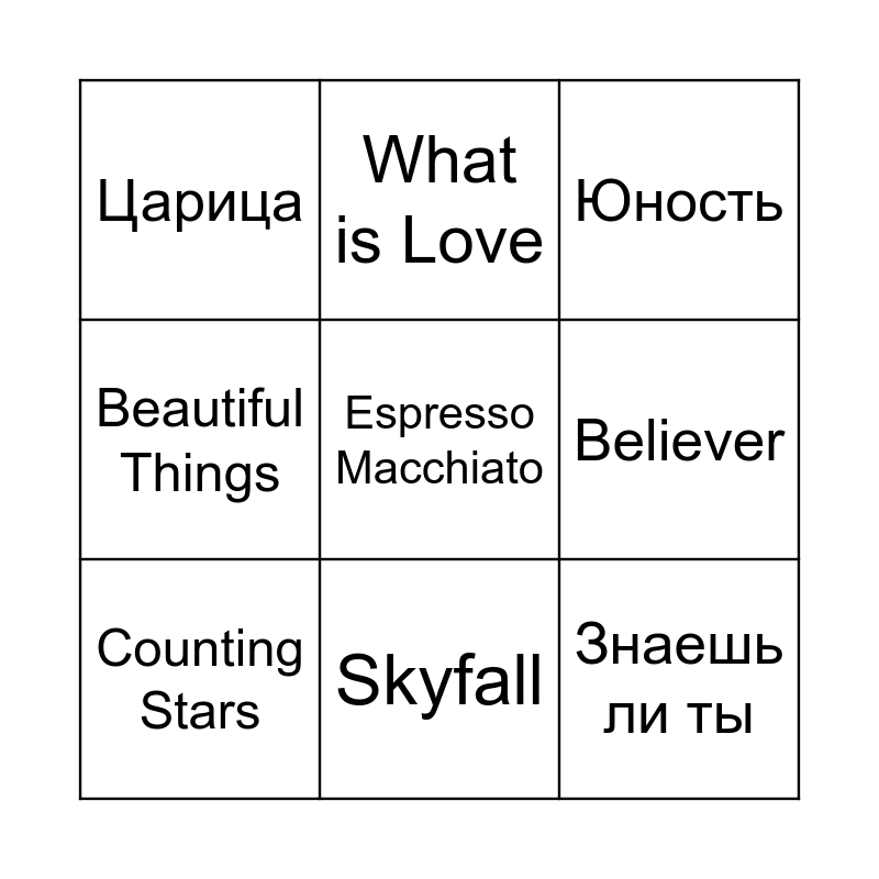 This bingo card has 20 words: Районы-кварталы, I got love, Юность, Freed From Desire, Сансара, Espresso Macchiato, Beggin', Царица, Знаешь ли ты, What is Love, Крошка моя, Жить в кайф, Believer, Комета, Counting Stars, Мурашками, Skyfall, Beautiful Things, Pedro and Само собой.