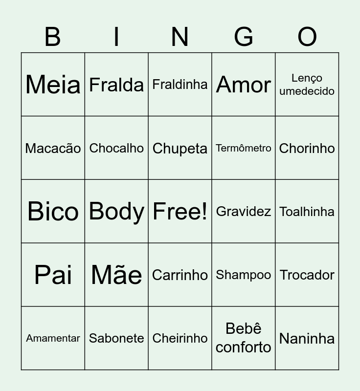 This bingo card has a free space and 66 words: Papai, Bico, Shampoo, Trocador, Chupeta, Mamãe, Fralda, Mamadeira, Chupeta, Bebê, Carrinho, Banheira, Toalhinha, Lenço umedecido, Pomada, Macacão, Body, Meia, Babador, Termômetro, Mãe, Pai, Amor, Ursinho, Leite, Colônia, Brinquedo, Berço, Naninha, Cueiro, Amamentar, Cólica, Charutinho, Roupinha, Shampoo, Sabonete, Paninho, Bico, Bebê conforto, Móbile, Chocalho, Laço, Gravidez, Teste, Ultrassom, Cegonha, Chorinho, Nascimento, Soneca, Mamãe, Papai, Tia, Dindo, Dinda, Passeio, No colo, Soninho, Boquinha, Fraldinha, Cheirinho, Enxoval, Dentinho, Vacina, Hospital, Rn (recém-nascido) and Amorzinho.