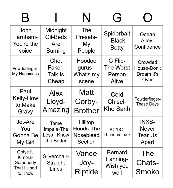 This bingo card has 25 words: Tame Impala-The Less I Know the Better, Vance Joy-Riptide, Hoodoo gurus -What's my scene, Gotye ft. Kimbra-Somebody That I Used to Know, Ocean Alley-Confidence, John Farnham-You're the voice, Powderfinger-My Happiness, Midnight Oil-Beds Are Burning, Cold Chisel-Khe Sanh, Hilltop Hoods-The Nosebleed Section, G Flip-The Worst Person Alive, Paul Kelly-How to Make Gravy, AC/DC-Thunderstruck, INXS-Never Tear Us Apart, Chet Faker-Talk Is Cheap, The Chats-Smoko, Powderfinger-These Days, The Presets-My People, Crowded House-Don't Dream It's Over, Alex Lloyd-Amazing, Matt Corby-Brother, Silverchair-Straight Lines, Jet-Are You Gonna Be My Girl, Spiderbait -Black Betty and Bernard Fanning-Wish you well.