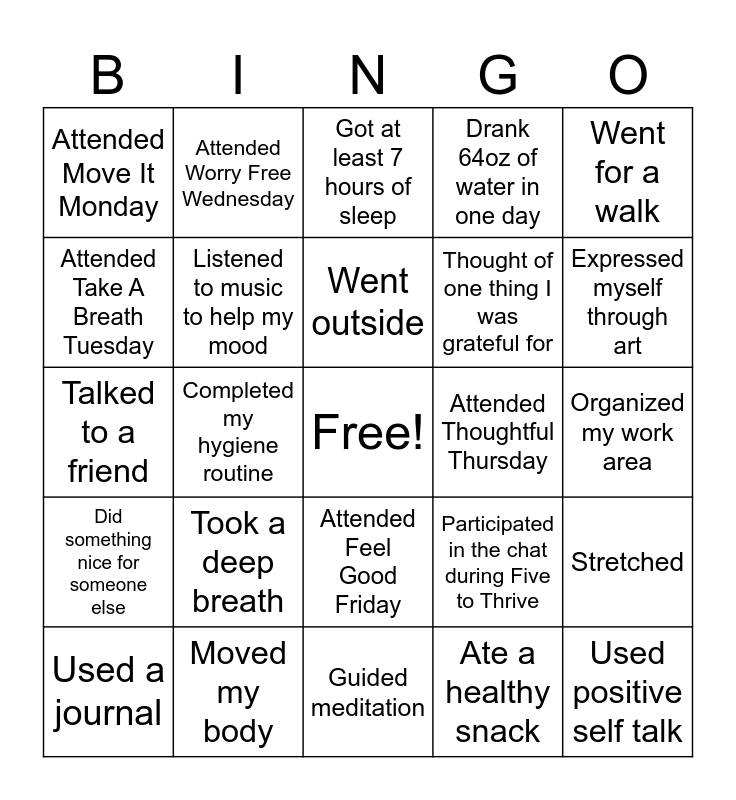 This bingo card has a free space and 24 words: Took a deep breath, Moved my body, Went outside, Used a journal, Went for a walk, Attended Move It Monday, Attended Take A Breath Tuesday, Attended Worry Free Wednesday, Attended Thoughtful Thursday, Attended Feel Good Friday, Thought of one thing I was grateful for, Talked to a friend, Participated in the chat during Five to Thrive, Stretched, Listened to music to help my mood, Ate a healthy snack, Organized my work area, Got at least 7 hours of sleep, Expressed myself through art, Completed my hygiene routine, Used positive self talk, Did something nice for someone else, Drank 64oz of water in one day and Guided meditation.