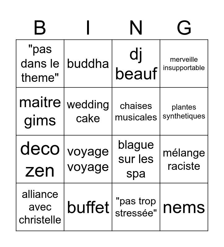 This bingo card has 16 words: buffet, mélange raciste, dj beauf, "pas dans le theme", deco zen, buddha, blague sur les spa, "pas trop stressée", maitre gims, wedding cake, alliance avec christelle, merveille insupportable, voyage voyage, plantes synthetiques, chaises musicales and nems.
