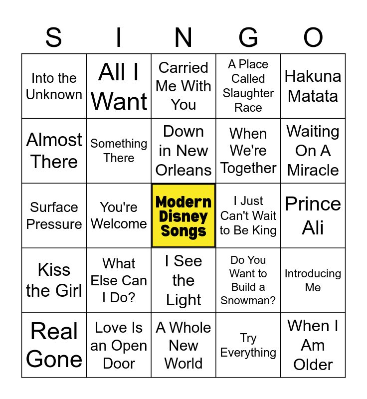 This bingo card has a free space and 30 words: Love Is an Open Door, Loyal Brave True, You're Welcome, How Far I'll Go, Into the Unknown, Carried Me With You, Something There, I See the Light, I Just Can't Wait to Be King, A Whole New World, Prince Ali, When I Am Older, Try Everything, What's This?, Waiting On A Miracle, Mother Knows Best, Do You Want to Build a Snowman?, Kiss the Girl, What Else Can I Do?, Hakuna Matata, Surface Pressure, Be Our Guest, All I Want, When We're Together, Almost There, A Place Called Slaughter Race, Introducing Me, Real Gone, Down in New Orleans and At All Costs.