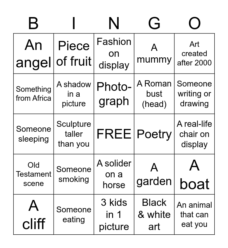 This bingo card has a free space and 49 words: Two skulls, An animal that can eat you, Abstract art, 3 kids in 1 picture, Someone smoking, From 1800s, Piece of fruit, A toy, Something from Africa, Something from England, A shadow in a picture, A mummy, A boat, A garden, Storm on an ocean, A musical instrument, Photo-graph, Poetry, Pop-art, Art created after 2000, Sculpture taller than you, Black & white art, An angel, A Roman bust (head), Newspaper, Someone writing or drawing, A cliff, An umbrella, A solider on a horse, Old Testament scene, New Testament scene, Battle, Dead cow, Shipwreck or remains of a shipwreck, Someone eating, Mary (Jesus' mother), A mirror, A real-life basket on display, A real-life chair on display, American Indian art, Art from 1700s, Baby Jesus, Forest, Jester (joker), Someone sleeping, Fashion on display, Log cabin, A wall hanging/ tapestry and Green couch.