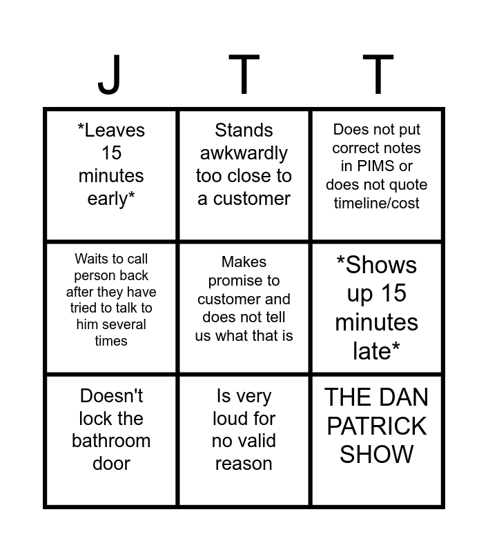 This bingo card has a free space and 8 words: *Shows up 15 minutes late*, Does not put correct notes in PIMS or does not quote timeline/cost, Stands awkwardly too close to a customer, Doesn't lock the bathroom door, *Leaves 15 minutes early*, THE DAN PATRICK SHOW, Waits to call person back after they have tried to talk to him several times and Is very loud for no valid reason.